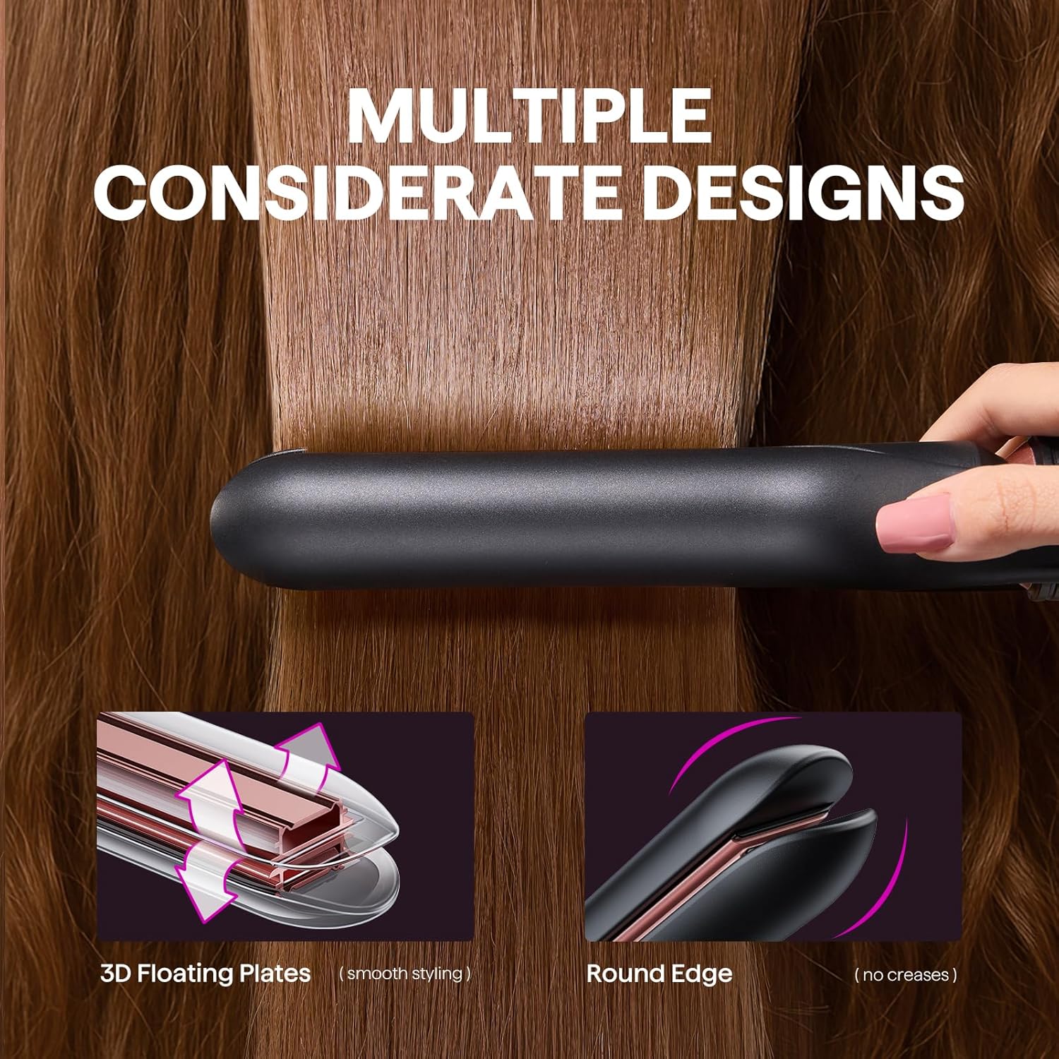 The 1 inch flat iron featuring a curved housing design and combined with 3D floating plates, allows you to get creative and style chic straight looks, bouncy curls or beachy waves without concerns of pulling or snagging.