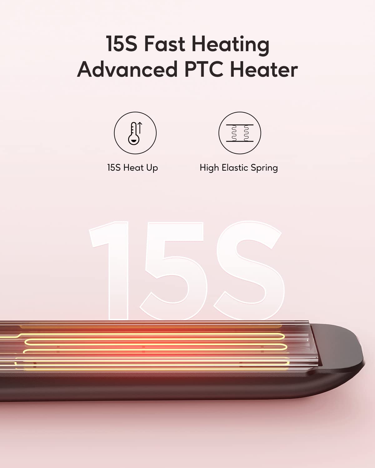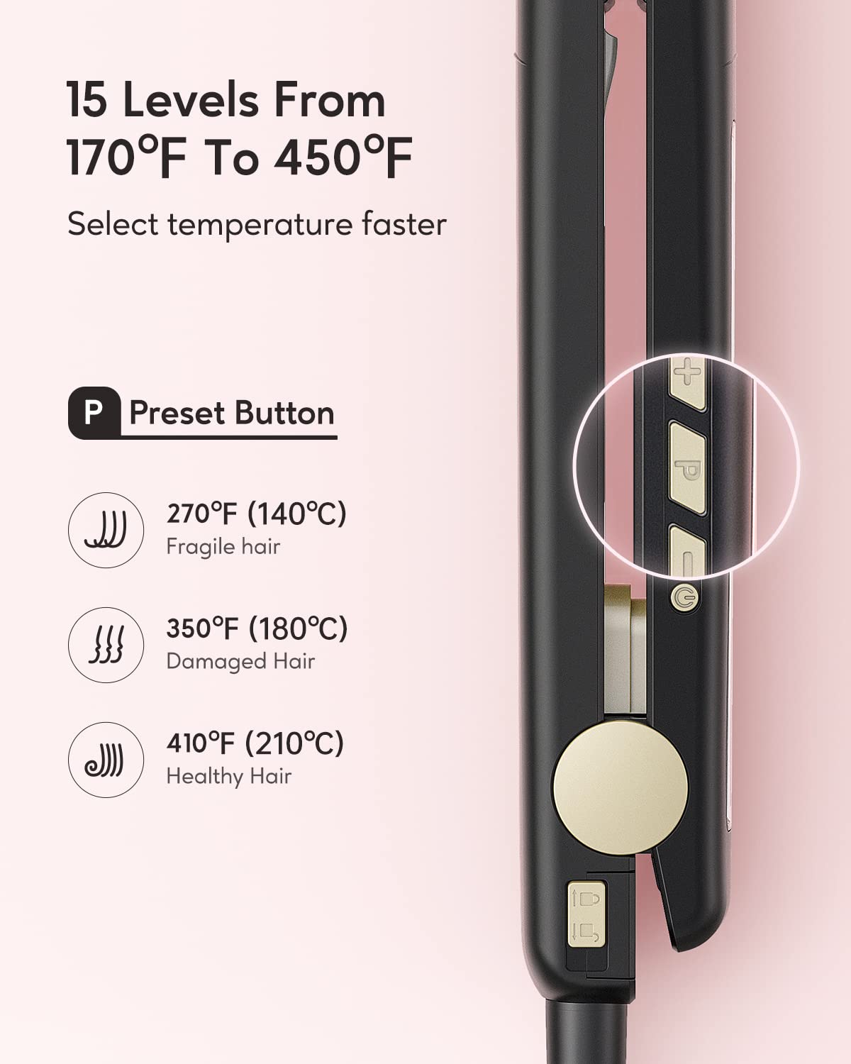 Faster heating up: the hair straightener with advanced PTC heater heats up in 15 S. Besides, the unique “P” preset button function achieves arrive 3 temperature settings(270℉, 350℉, 410℉) more quickly. Smooth results with less frizz in half the time