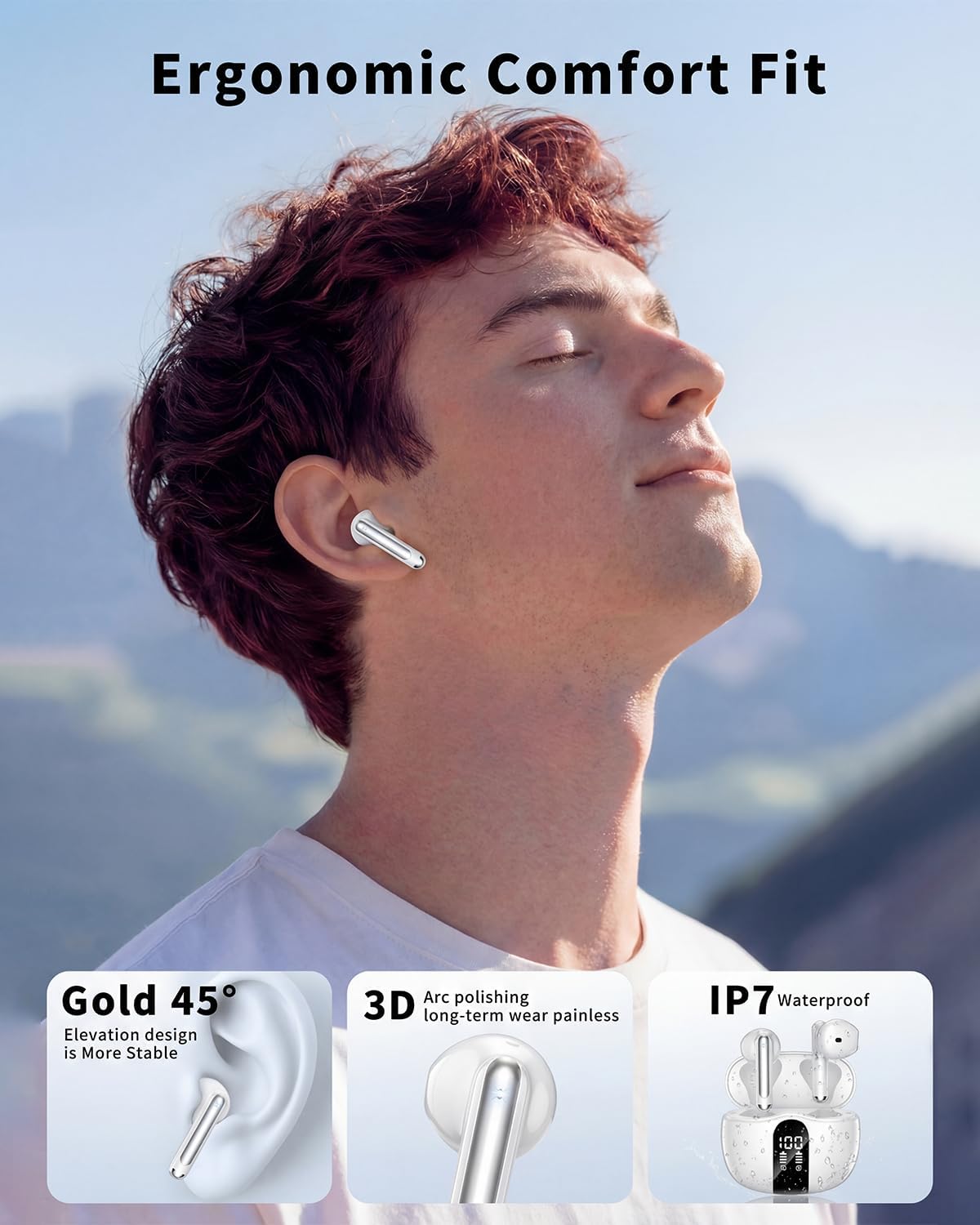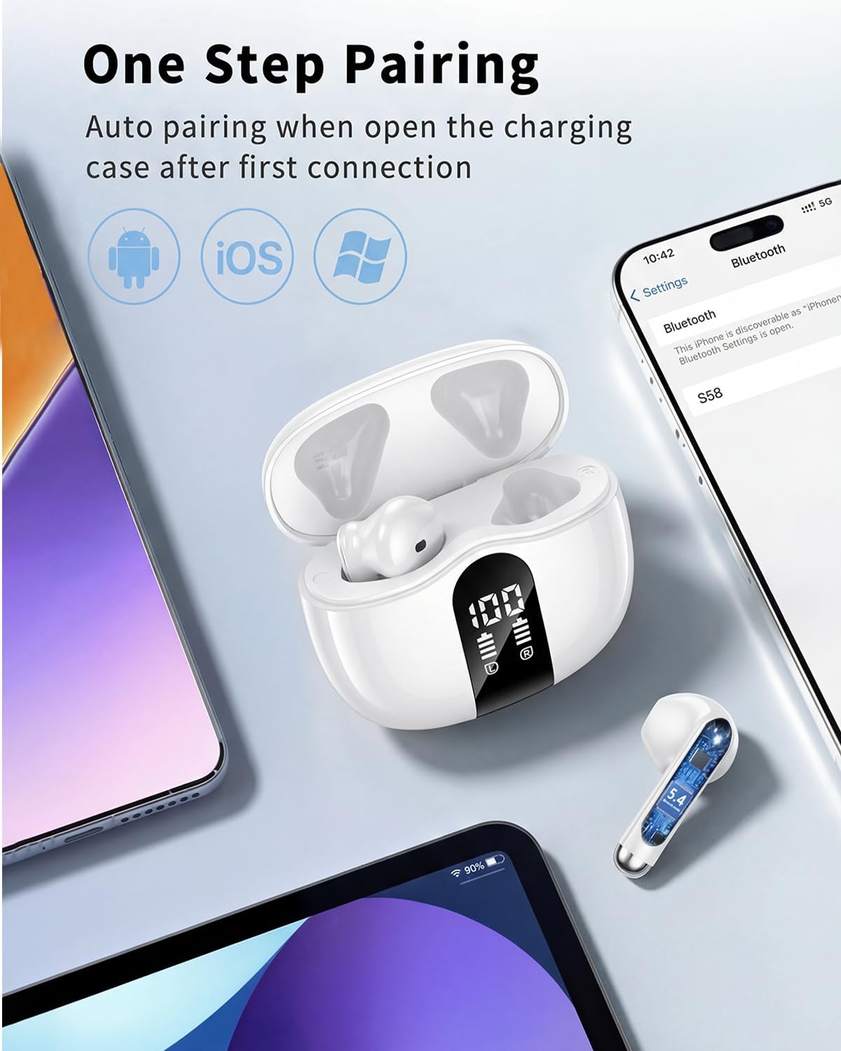 Wireless Earbuds, Bluetooth 5.4 Headphones HiFi Stereo, Ear Buds with 50H Playback, LED Display Wireless Earphones Clear Calls, IP7 Waterproof, Bluetooth Earbuds for Laptop/Phones/Sports, White