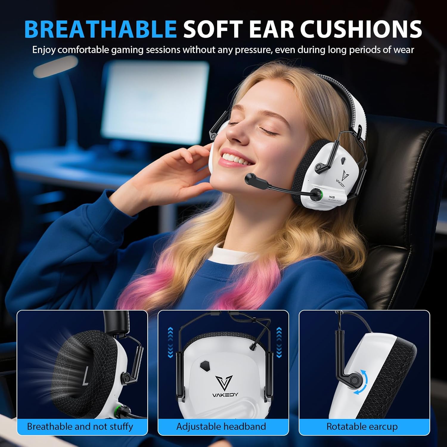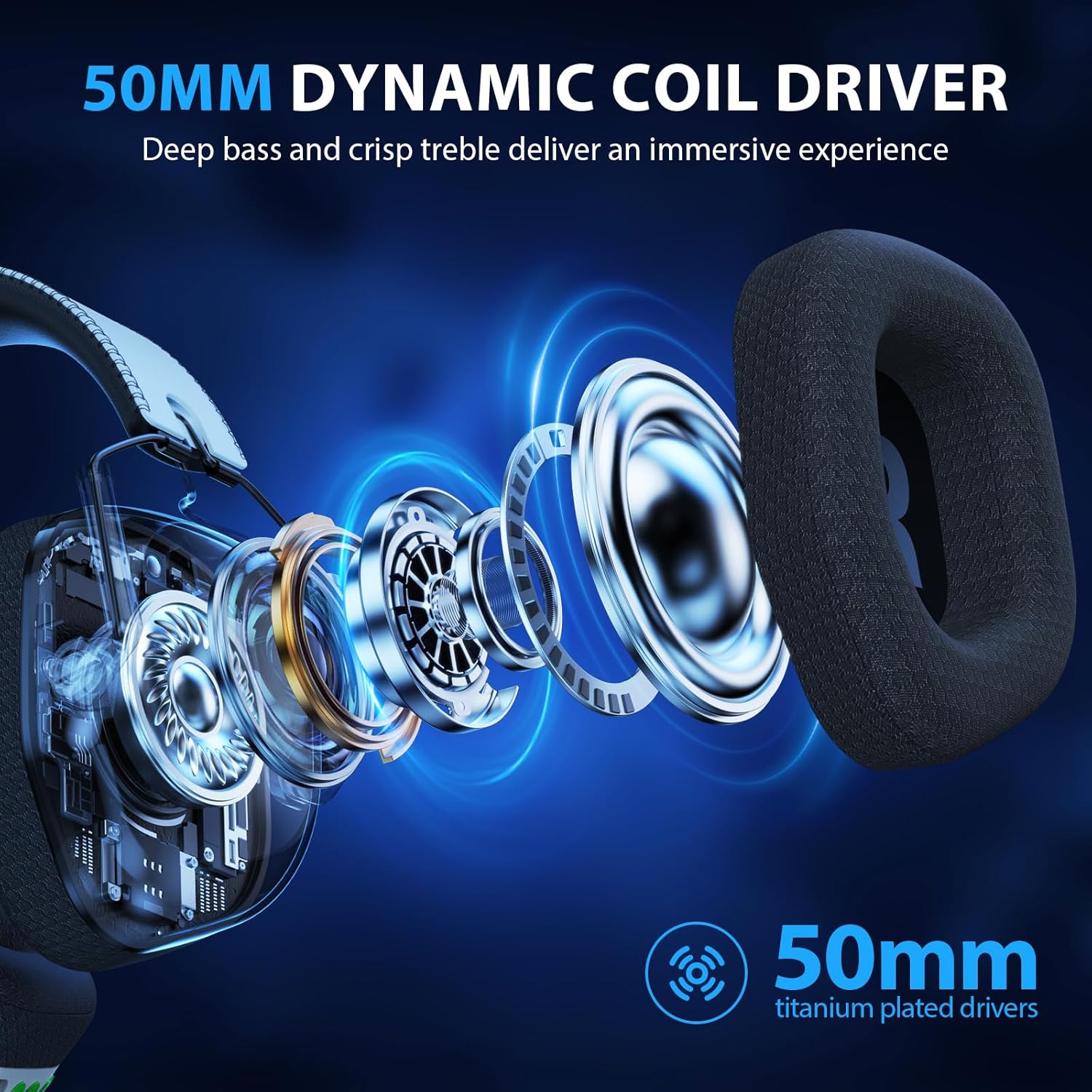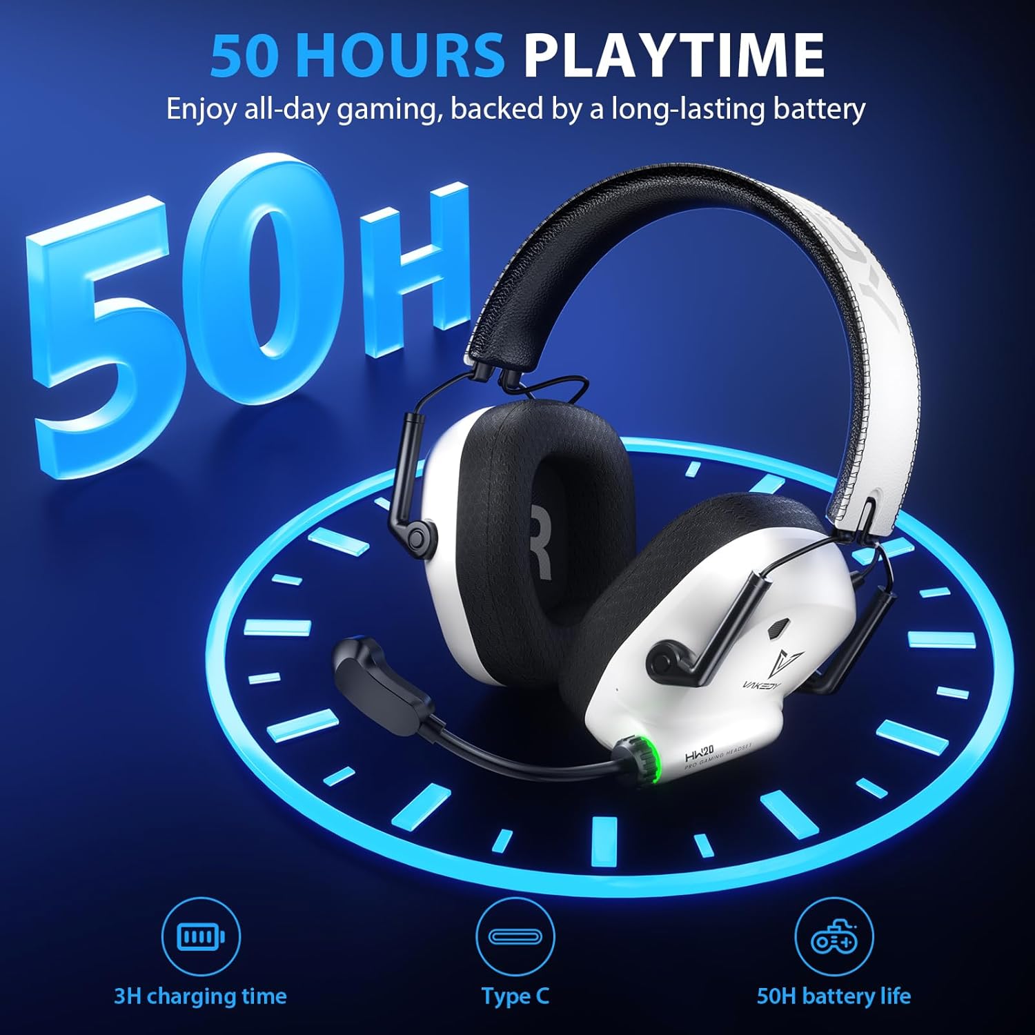 【50H Battery Life】Wireless PC gaming headset boasts an impressive 50-hour continuous gameplay runtime with a voice alert for low power, and charging the over ear headphone fully takes only 3 hours. The battery life varies by usage, you might need to charge it every 3-4 days on light use or charge it every 1-2 days heavy use. Whether you’re gaming, chatting, or listening to music, it keeps up with your rhythm.