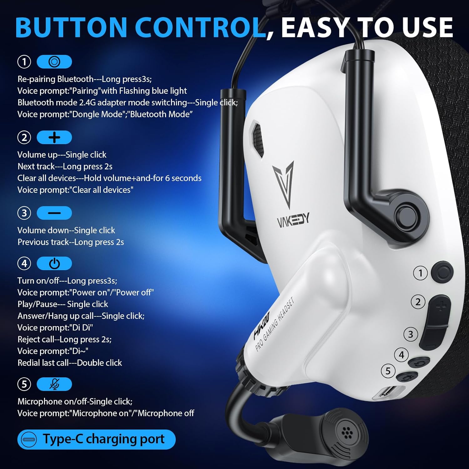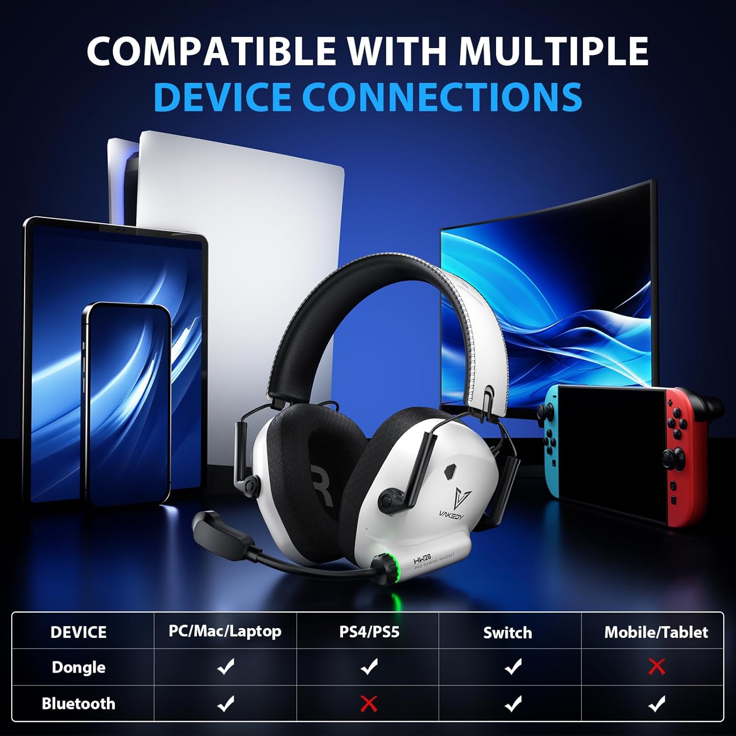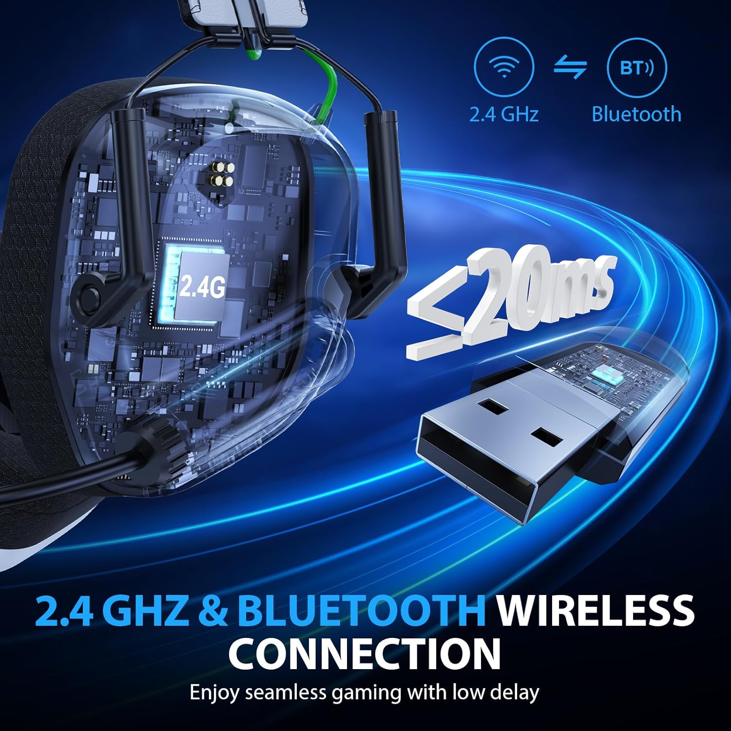 【Multi-platform Compatibility】This wireless gaming headset offers 2 versatile connection modes: 2.4GHz USB dongle and Bluetooth 5.4, both ensuring stable, delay performance. 2.4GHz USB wireless mode is compatible with PC, PS4, PS5, laptops, Mac, and Switch (note: external microphone is not supported on Switch). Bluetooth 5.4 mode works seamlessly with PC, tablets, smartphones, and laptops (note: microphone function is inactive when connected to PC via Bluetooth).