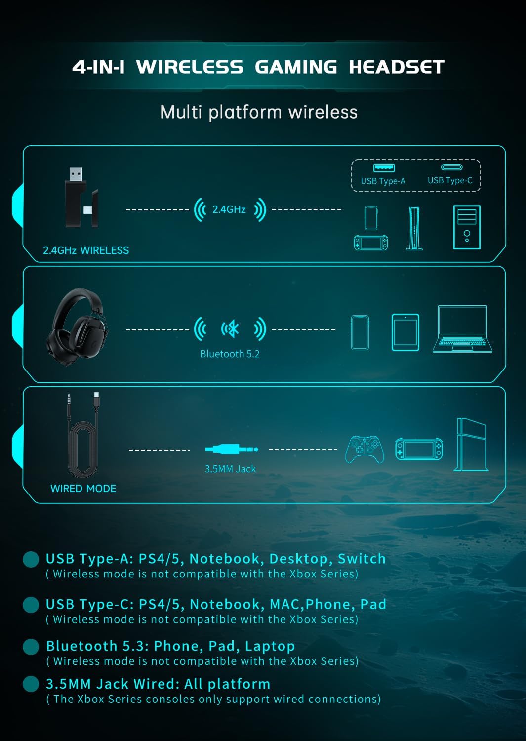 Versatile Connectivity: Supports both 2.4GHz wireless and Bluetooth 5.3 connections, along with wired options, ensuring seamless switching and broad device compatibility for gaming consoles, PCs, and mobile devices