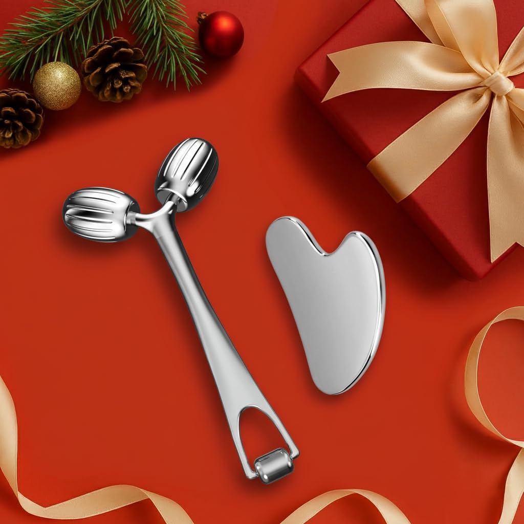 All-Metal Skincare Tools for Daily Use – This guasha tool for face and stainless steel face roller are made entirely of metal, offering a cooling, refreshing feel that elevates your skincare routine. Ideal for those who love high-quality face massager tools.